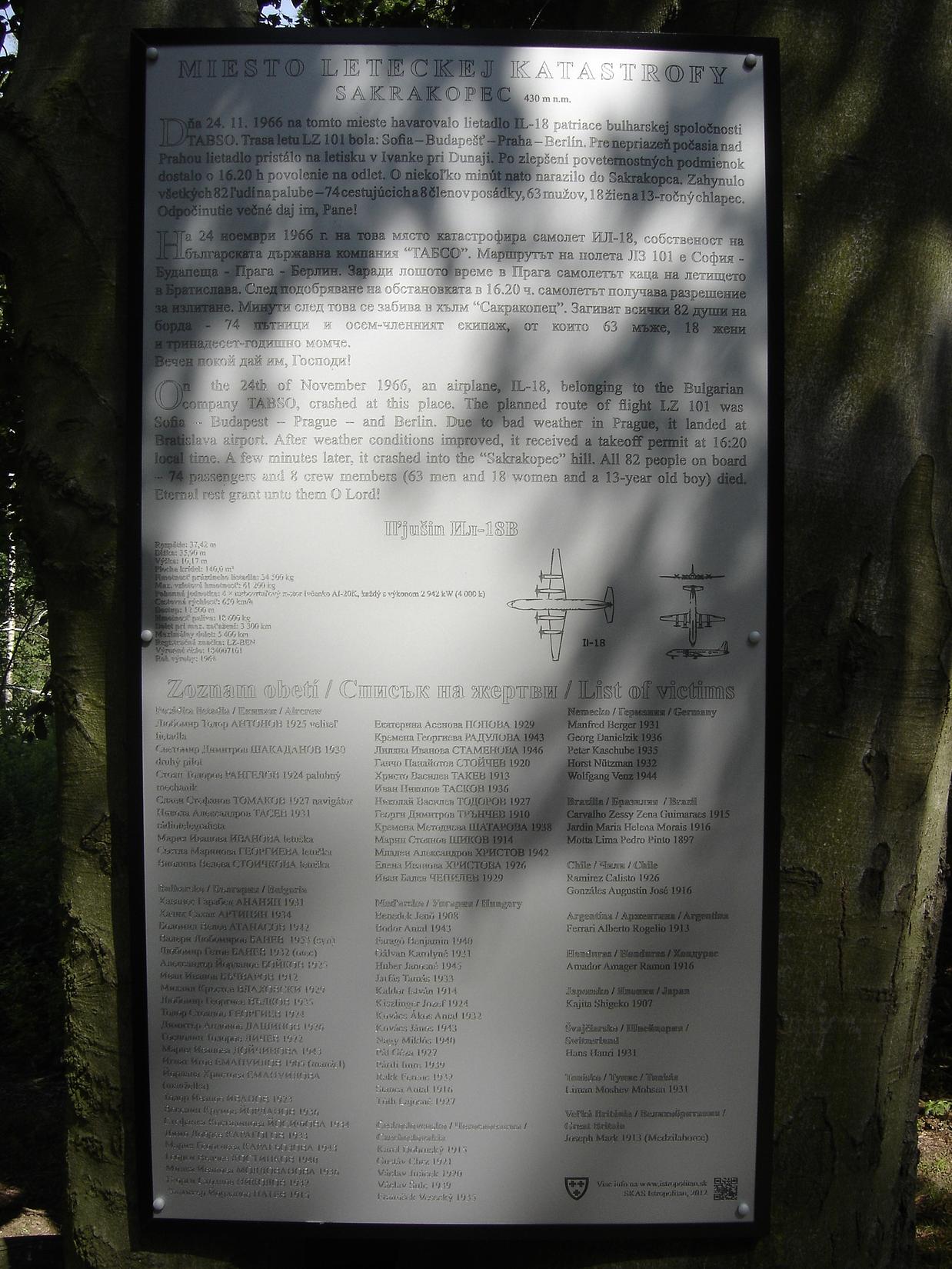 A Bolgár Légiközlekedési Vállalat Szófia–Budapest–Prága–Berlin között közlekedő menetrend szerinti járatának gépe november 24-én délután hat óra körül Pozsony közelében lezuhant. A katasztrófa körülbelül tizenöt kilométerre a szlovák fővárostól történt. A gép felszállt a pozsonyi repülőtérről és irányt vett Prága felé. A repülőtértől megközelítőleg tizenöt kilométerre a gépnek át kellett volna repülnie a Pozsonyt körülvevő Kis-Kárpátok hegyei fölött. A pozsonyi repülőtér parancsnoksága tagjainak nyilatkozata azt tanúsítja, hogy a katasztrófa oka minden valószínűség szerint az volt, hogy a gép nem előírt magasságban repült és nekiütközött a Kis-Kárpátok erdős lankáinak. A szakértők előzetes megállapítása szerint a repülőgép eltért a helyes iránytól. Ennek okát most vizsgálják. Van olyan verzió, hogy az ellenőrző torony parancsnoka több ízben felhívta a repülőgép parancsnokának figyelmét a gép helytelen irányára és magasságára. A tanúk szerint a gép rendkívül alacsonyan, a gyári kémények fölött repült.”