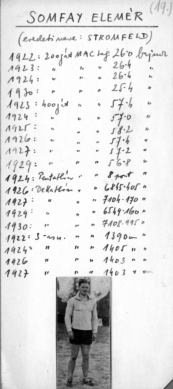 Stromfeld Elemér 1898-ban született Budapesten, nagybátyja Stromfeld Aurél későbbi vezérkari főnök volt, és maga is a katonai pályát választotta. Kitüntetéssel végzett a bécsújhelyi Mária Terézia Akadémián, az első világháborúban az orosz és az olasz fronton is harcolt, tizenegyszer tüntették ki, de a harcok során súlyos sebesülést szerzett, szuronnyal átdöfték a tüdejét. „1918-ban sántán, bénán, emberroncsként sántikálva, senki, én magam sem álmodtam a sportról” – vallotta be később. Csak felépülése után, huszonkét évesen kezdett el atletizálni, 1920-ban a Magyar Atlétikai Club (Ludovika Akadémia Sportegyesület) tagja lett, sokoldalúságát jól jelzi, hogy számos versenyszámban ért el kiemelkedő eredményt. A Magyar Olimpiai Bizottság bajban is volt, mikor meg kellett határoznia, milyen számban indítsa el az 1924-es párizsi olimpián, és mivel a hírek szerint egyik edzésen az akkori világcsúcsnál is nagyobbat ugrott, a hármasugrást jelölte meg. Azonban a felkészülés közben, a megfeszített edzésmunka miatt csonthártyagyulladás alakult ki a nevét akkor már Somfayra magyarosító sportoló sarkában, így alig tudott járni, nemhogy ugrani, vagy gátat futni.