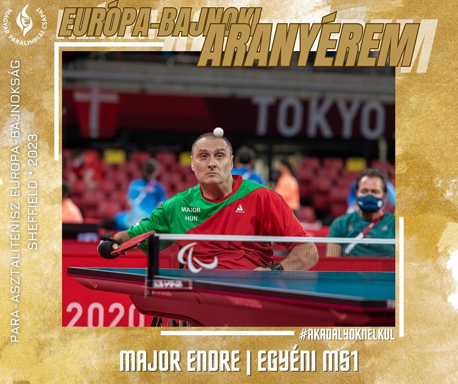 Angliában, azon belül Sheffieldben rendezték meg a 2023-as Európa-bajnokságot, ahol a legelején elveszítette a csoportmérkőzését a hazai pályán szereplő Robert Davies ellen. Ám utána nagyszerű győzelemmel vágott vissza neki. Az első játszma sikeres volt, a másik kettő esetében nem így lett. Mindenesetre a többször előforduló hibák ellenére sikerült 3:2-re fordítani, amivel megnyerte és feljutott a kontinens csúcsára. A sportkarrierje alatt eddig ez lett a legjobb eredménye, amivel kvótát is szerzett a 2024-es párizsi paralimpiára, ahol végül paralimpiai bronzérmes lett asztalitenisz MS1 egyéni kategóriában. 2024 szeptember 26-án az Országház Kupolatermében került sor a XXXIII. Nyári Olimpiai Játékokon és a XVII. Paralimpiai Játékokon kiemelt eredményt elért sportolók és sportszakemberek állami kitüntetéseinek átadására, így Major Endre a Magyar Arany Érdemkereszt polgári tagozat kitüntetést vehette át.