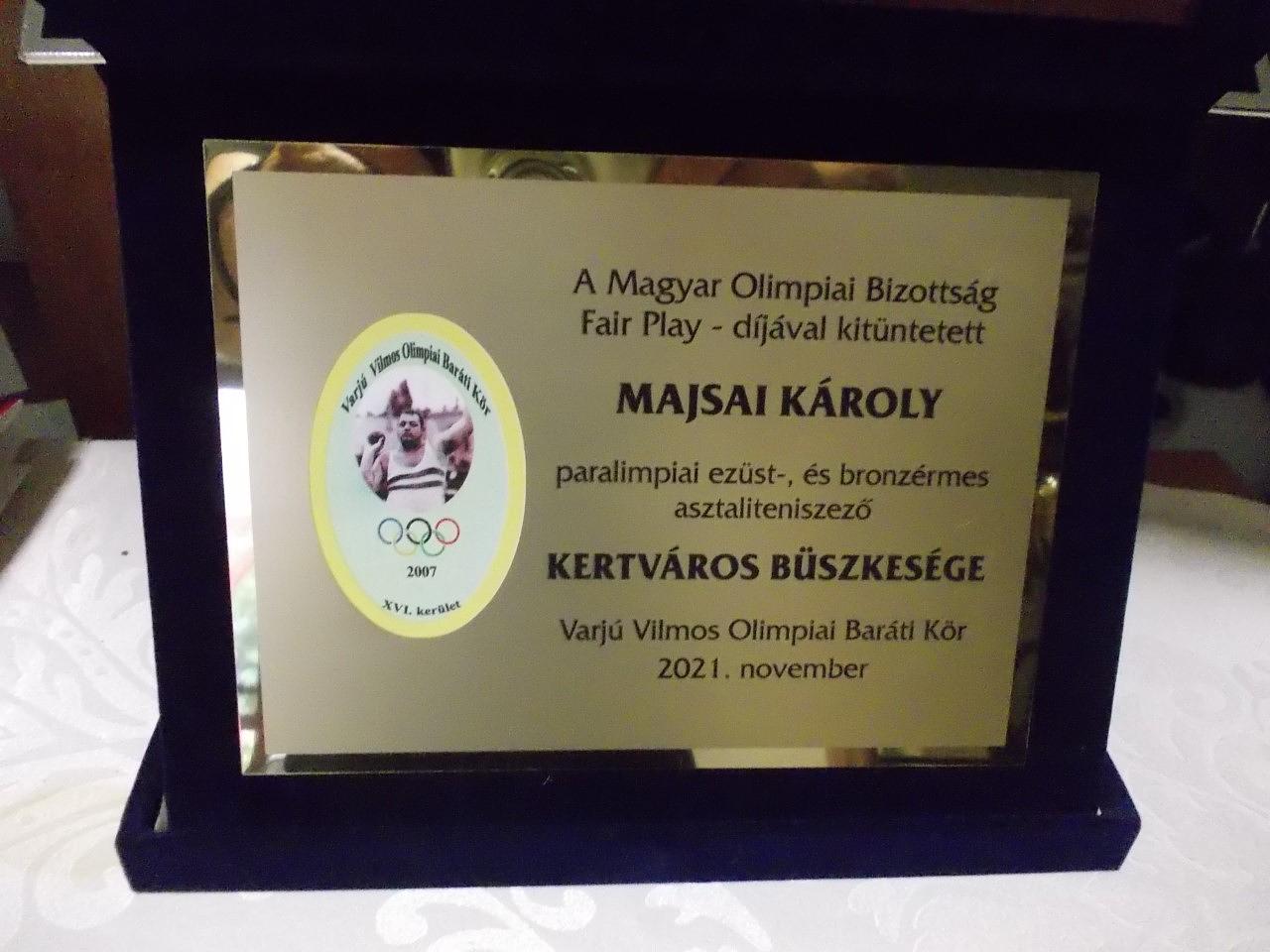 2021-ben két szép elismerésben részesült Majsai Károly. A Varjú Vilmos Olimpiai Baráti Kör a „Kertváros Büszkesége” oklevelet adományozta neki, másrészt a Magyar Olimpiai Bizottság Fair Play Bizottsága jutalmazta őt diplomával „Fair Play Cselekedet” kategóriában. A paralimpiai érmek után járó járadék egy részét hosszú ideje utalja a korábbi para-asztaliteniszező Erdei Ilonának, aki szintén kiemelkedő alakja volt a sportágnak, de paralimpiai medált nem szerzett.