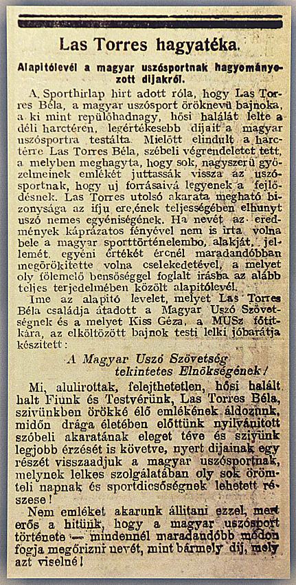 „A hazai sportélet legragyogóbb jelensége volt Las-Torres Béla, a háború előtti években nemcsak Európa, de az egész világ legkiválóbb all-round úszója, aki rövid-, közép- és hosszútávokon egyaránt verhetetlen volt. Las-Torres a háború kitörésekor rögtön bevonult és a repülők között teljesített szolgálatot az olasz fronton. Mint repülőtiszt is bravúrt bravúrra halmozott. Egy alkalommal felderítőszolgálaton volt és csak késő este tért vissza. A sötétségben irányt tévesztett, és Castelnuovo felett tévedésből egy osztrák csapattest lelőtte a gépét. Las-Torres negyven méter magasságból zuhant a sziklákra, de csodálatos módon csak nyílt bordatörést szenvedett. Első segély után hátra szállították és egy tábori kórházban megoperálták. Sajnos, Las Torres az operáció következtében sepsist kapott és ez kivégezte. Castelnuovóban temették el.” – szólt egy későbbi, a sportpályafutást kellő pátosszal megszínező visszaemlékezés.